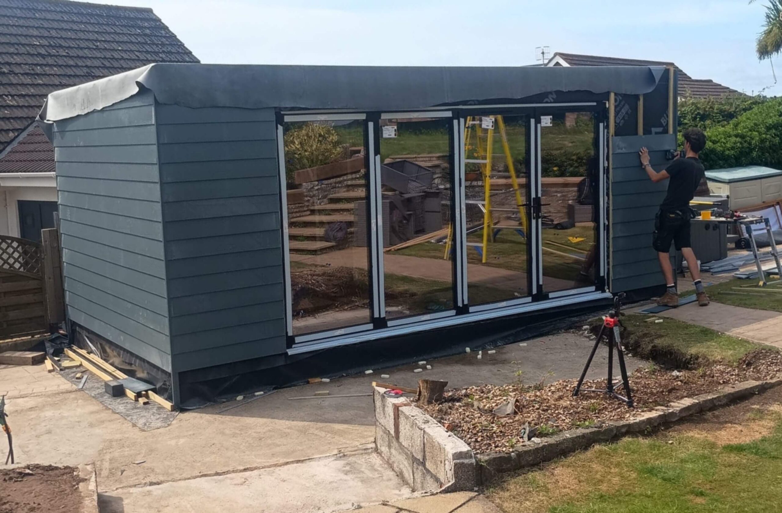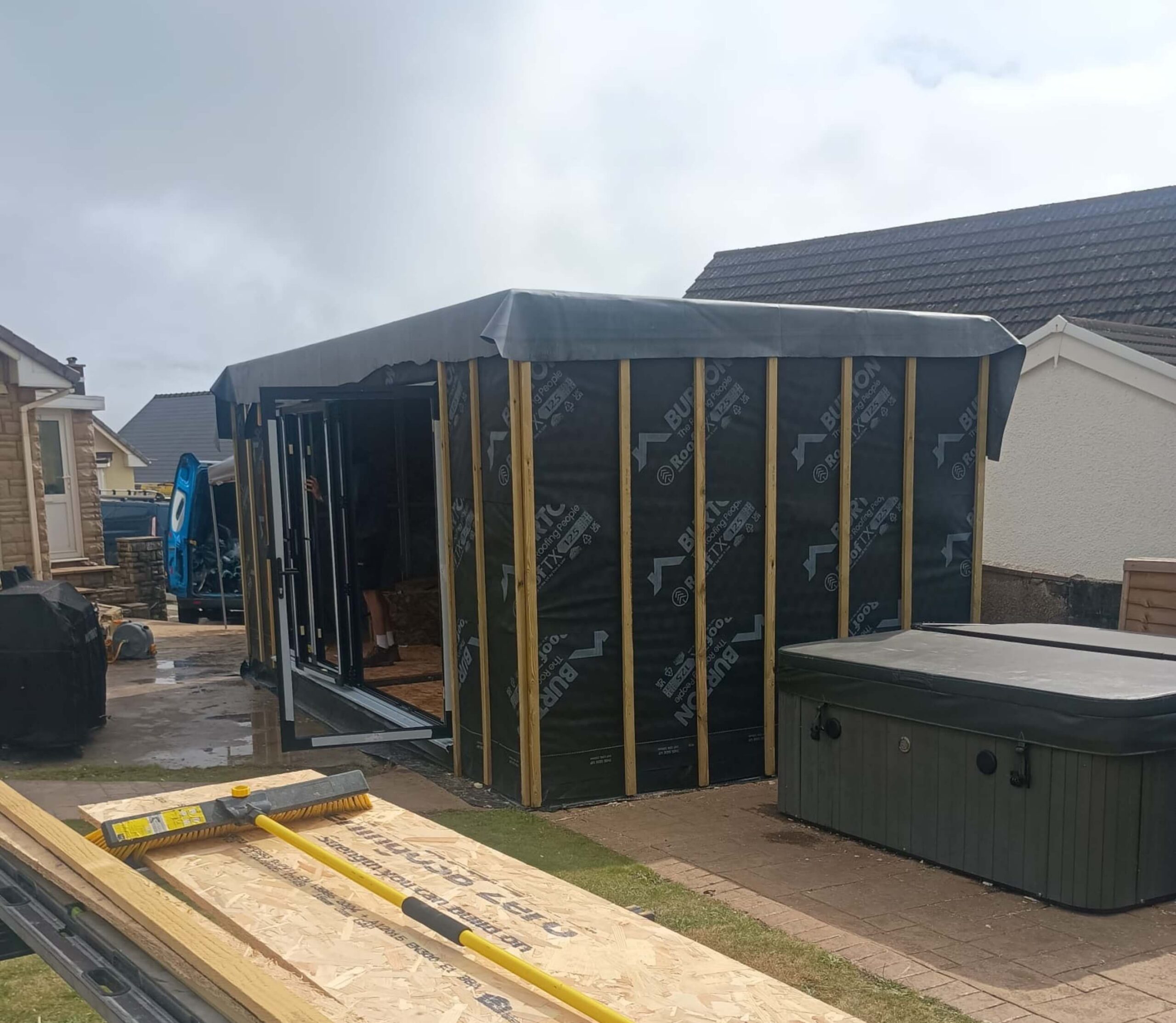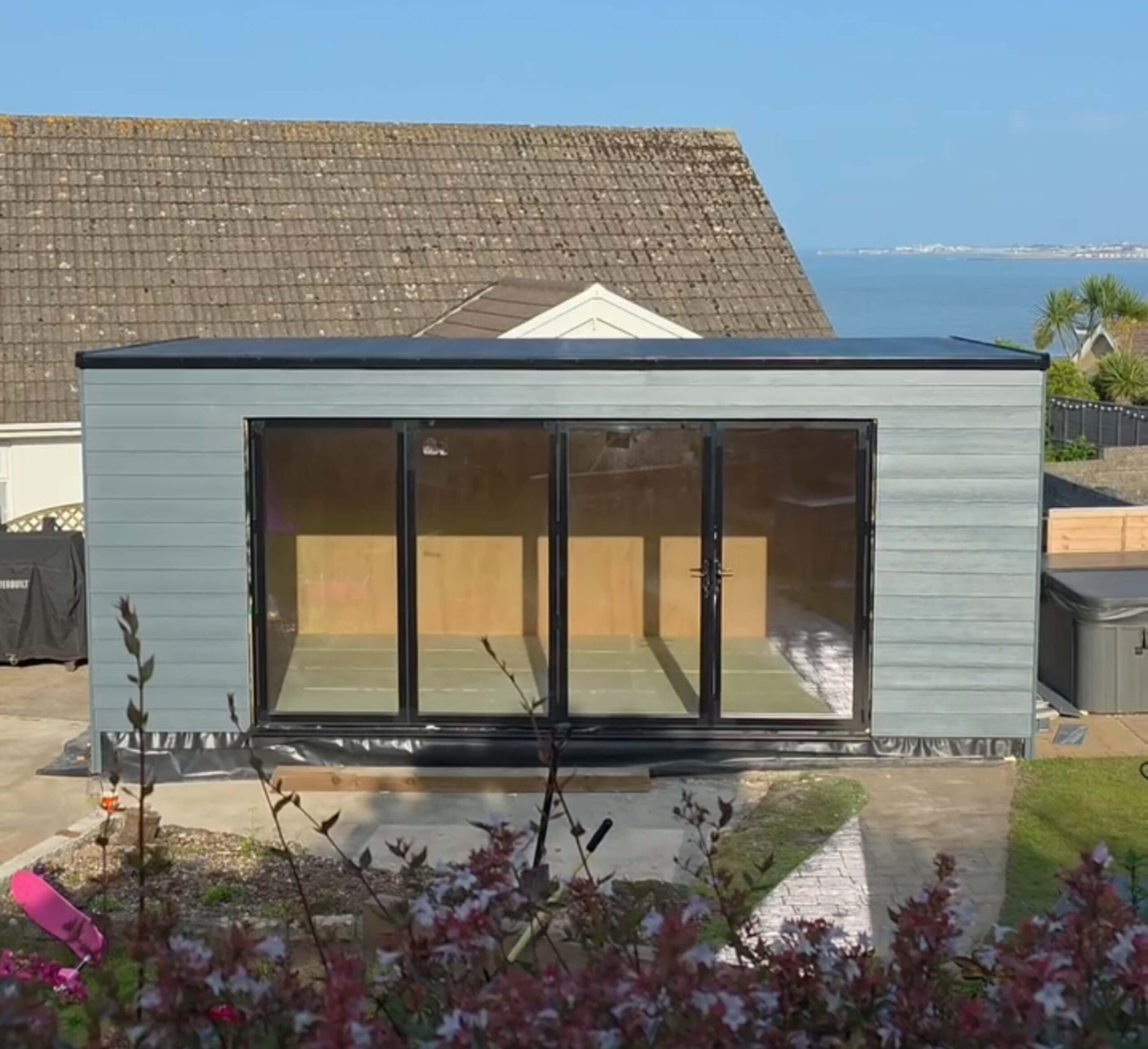 A charming insulated garden room designed and built by our team in Cardiff, complete with a galvanised steel base, composite cladding, bifold doors, a durable rubber roof, and finished with practical fixtures such as lighting and electrical sockets.