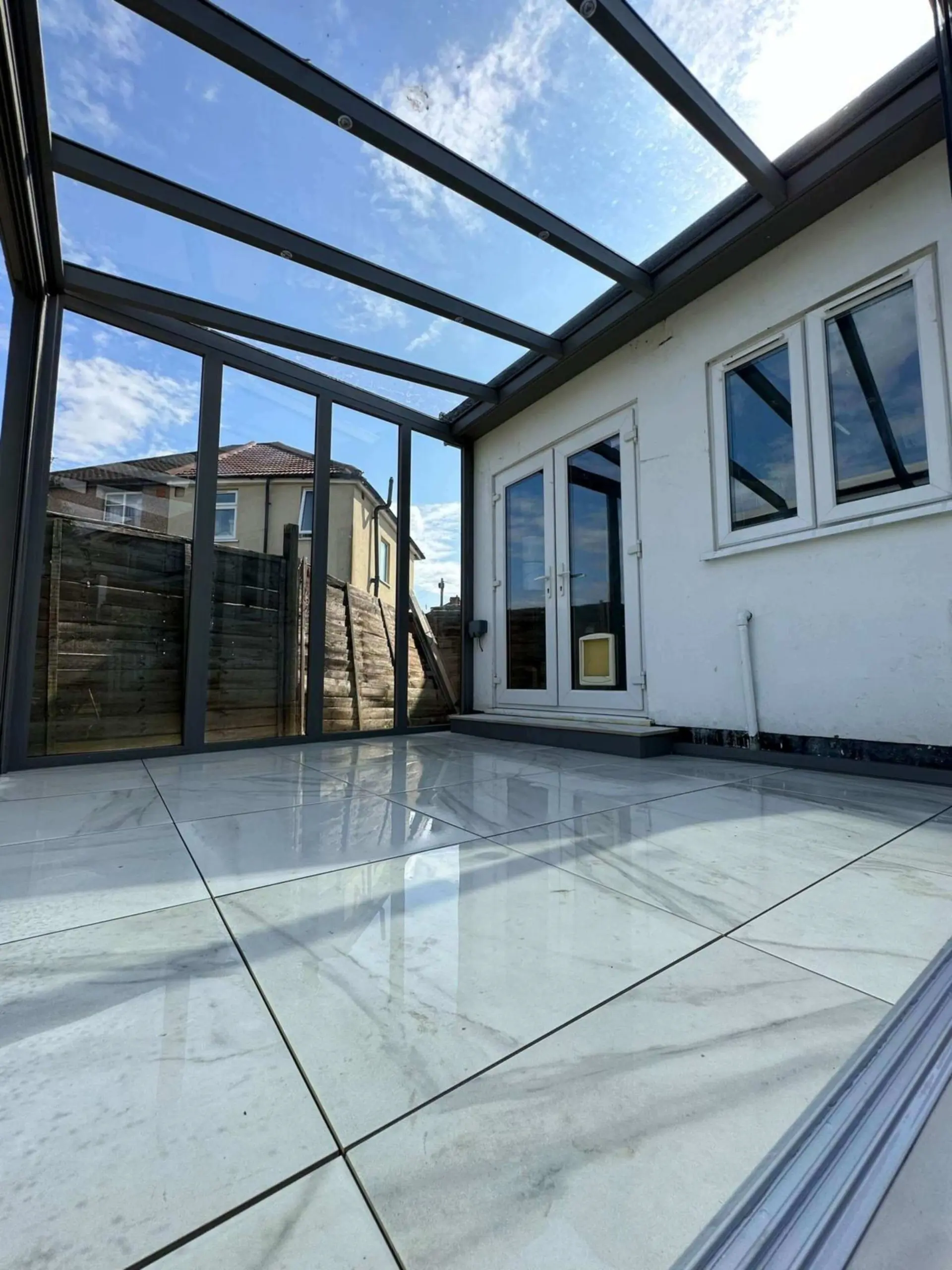 Shown below is an anthracite grey aluminium framed glass room veranda, measuring 3.5 x 3 metres, designed and installed over a new patio by our experienced team in London.