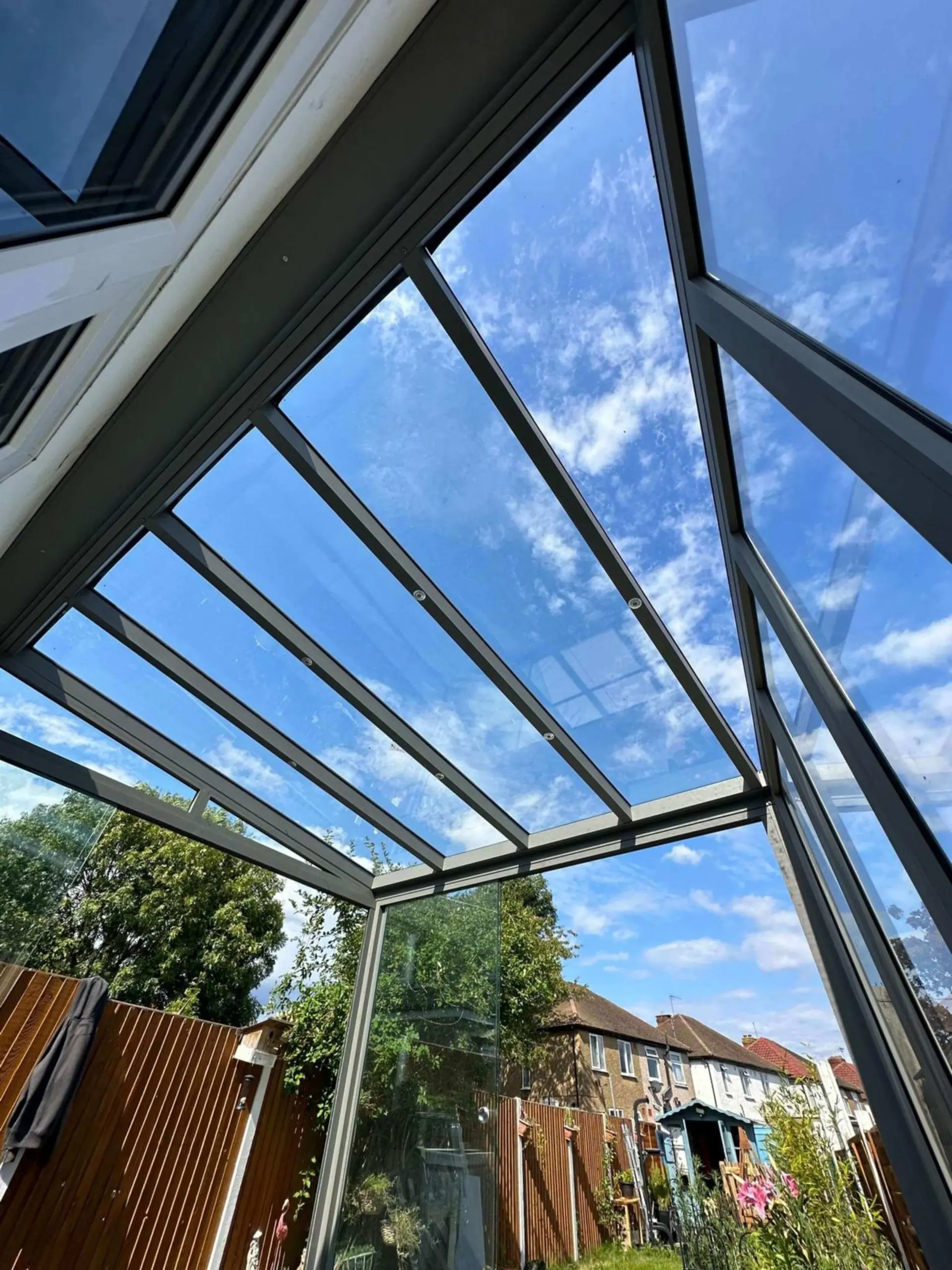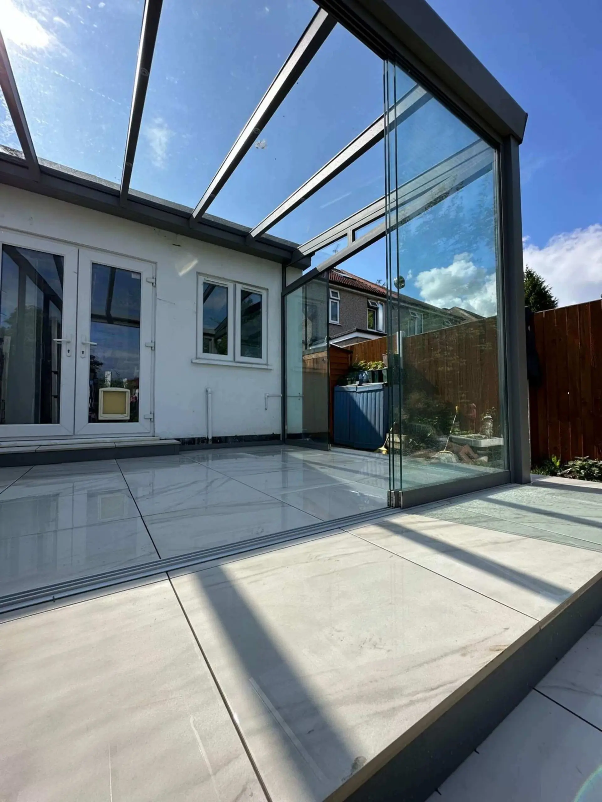 Enclosed with stylish lockable glass sliding doors and fixed glass panels on one side, the structure creates a fully finished glass room, a versatile space ready to be furnished and styled to suit personal taste.